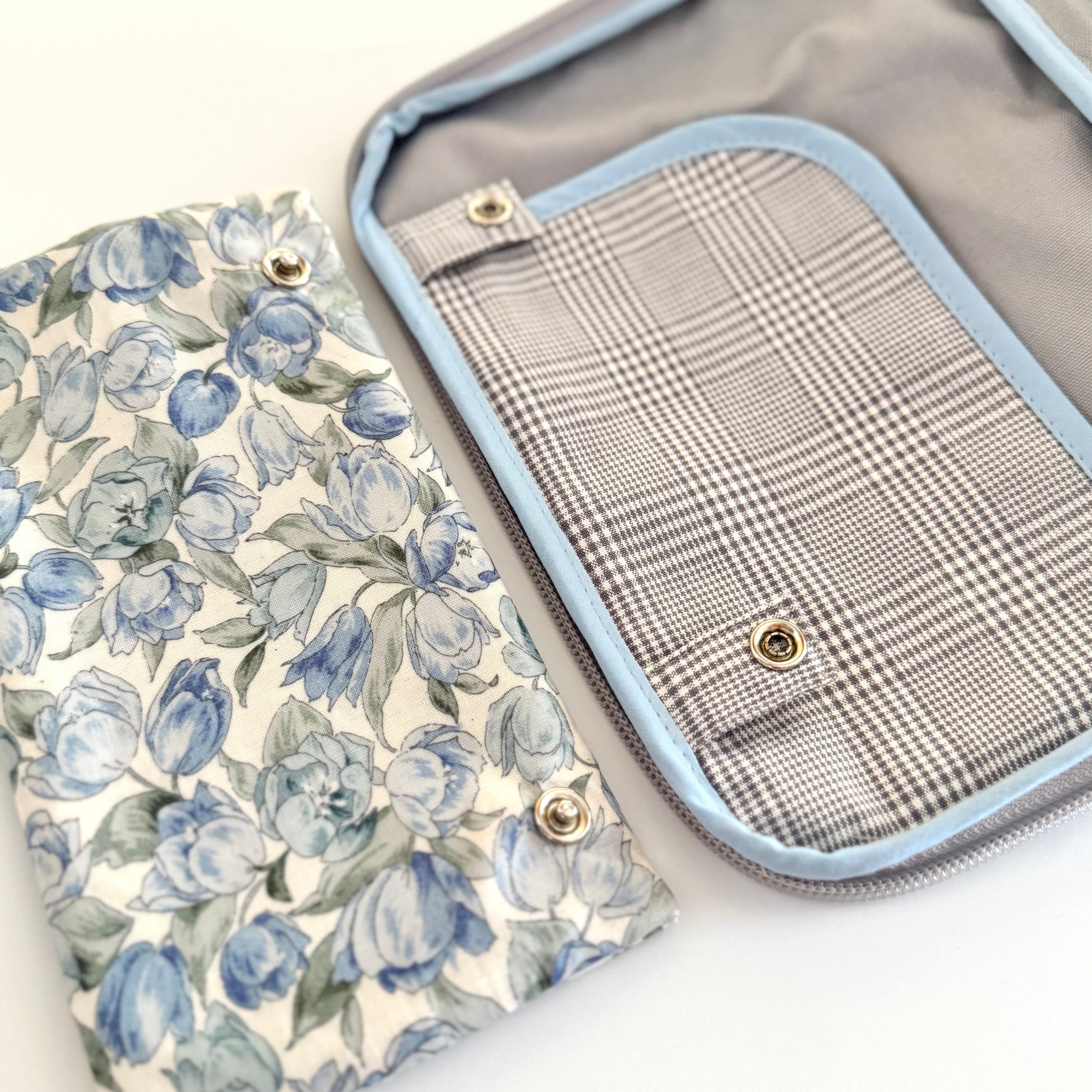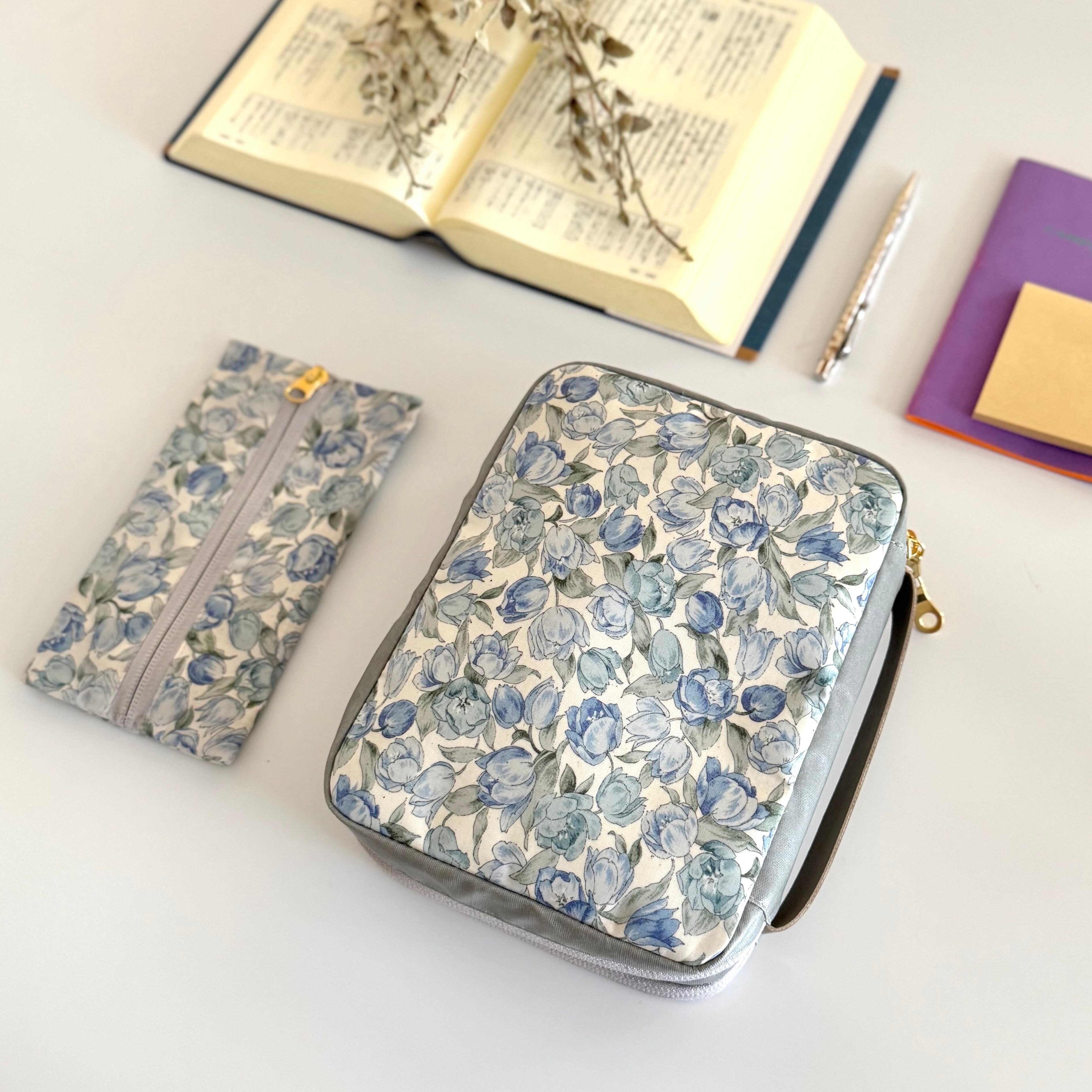 収納力バツグン!ペンも付箋もメモ帳もワンセットで持ち歩ける中型聖書カバー◆ブルー花柄