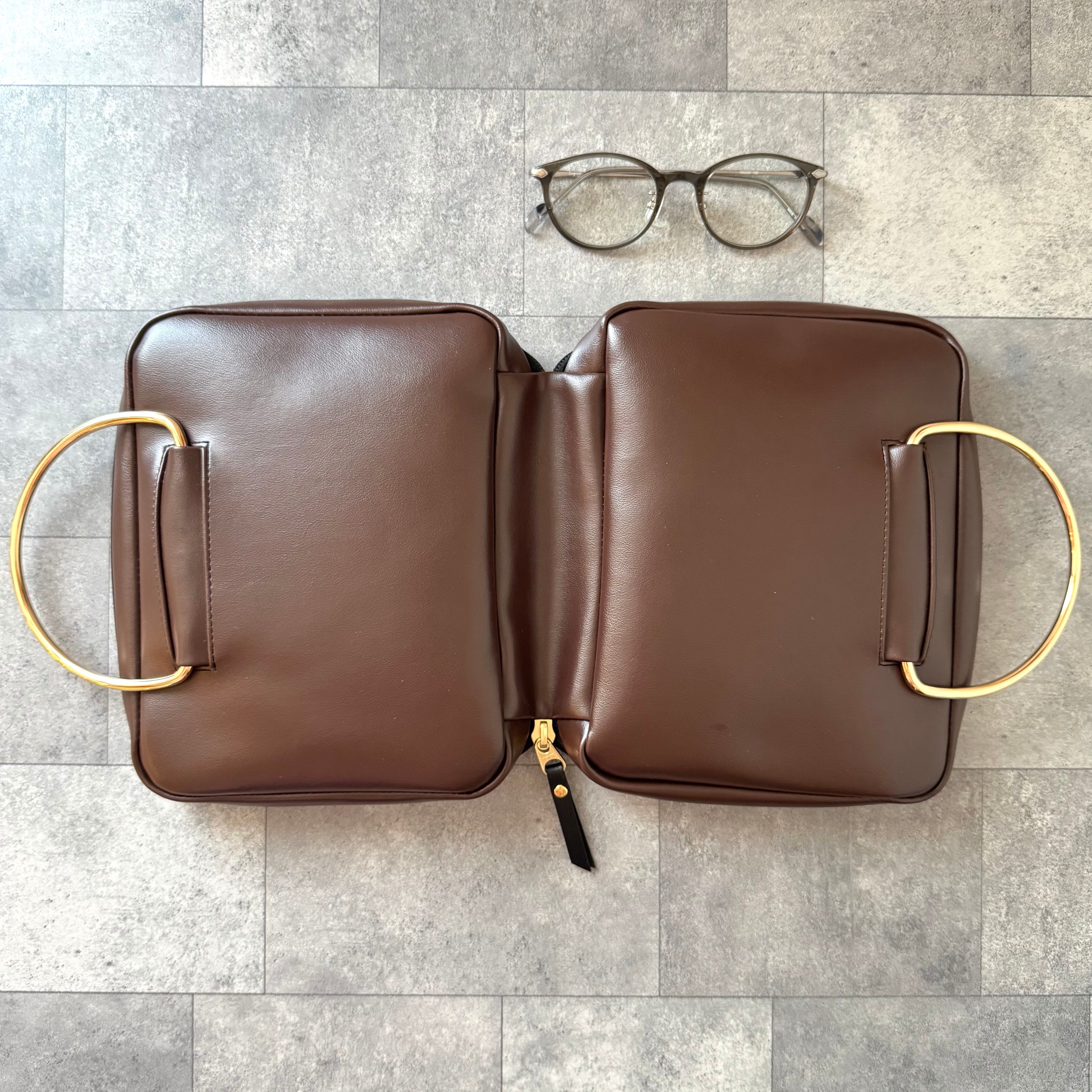 マットなブラウンの合皮にゴールドの金具を合わせてクラッシックで落ち着いた印象に仕上げました。