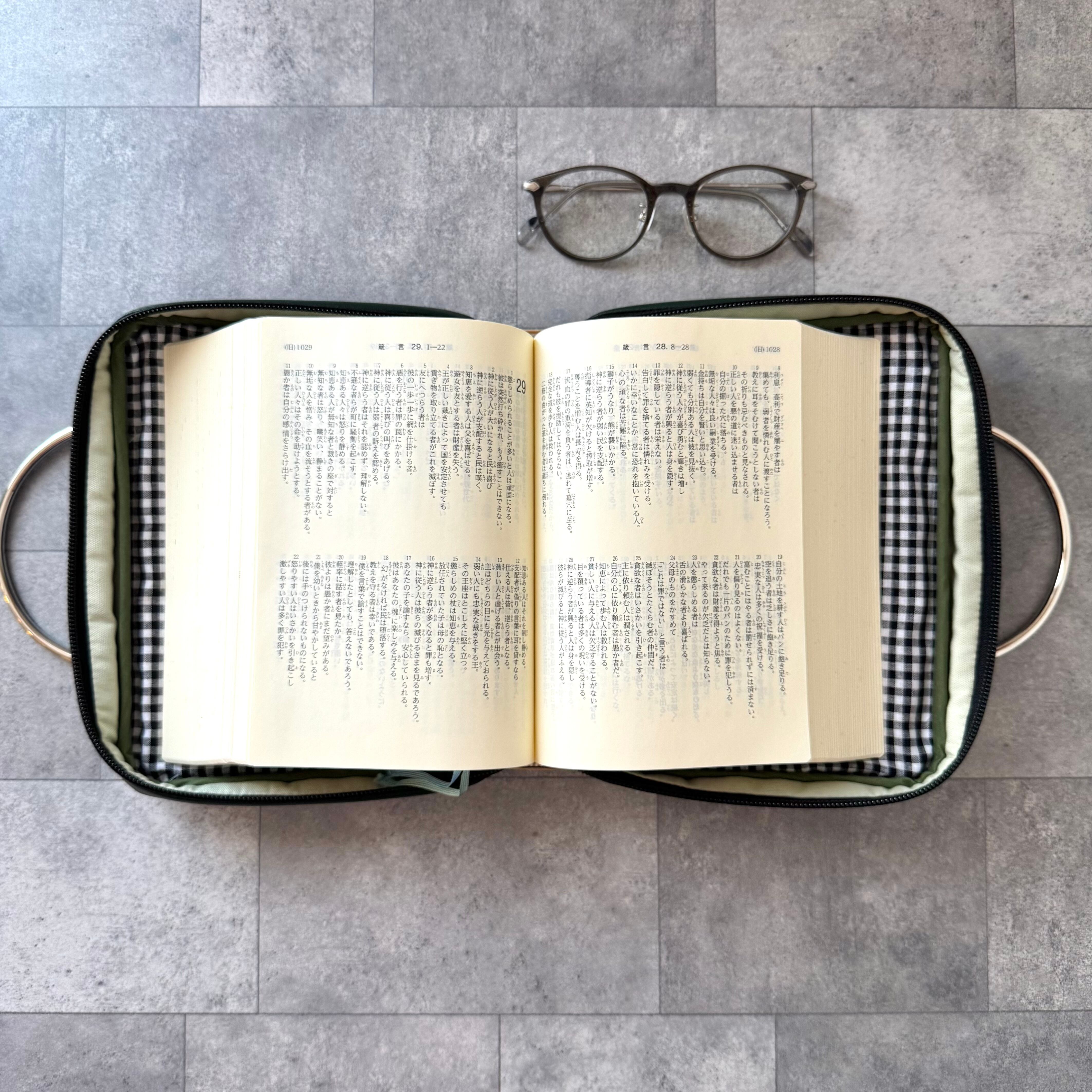 ファスナーで開閉するため大切な聖書を上下左右、全方位しっかりガード。