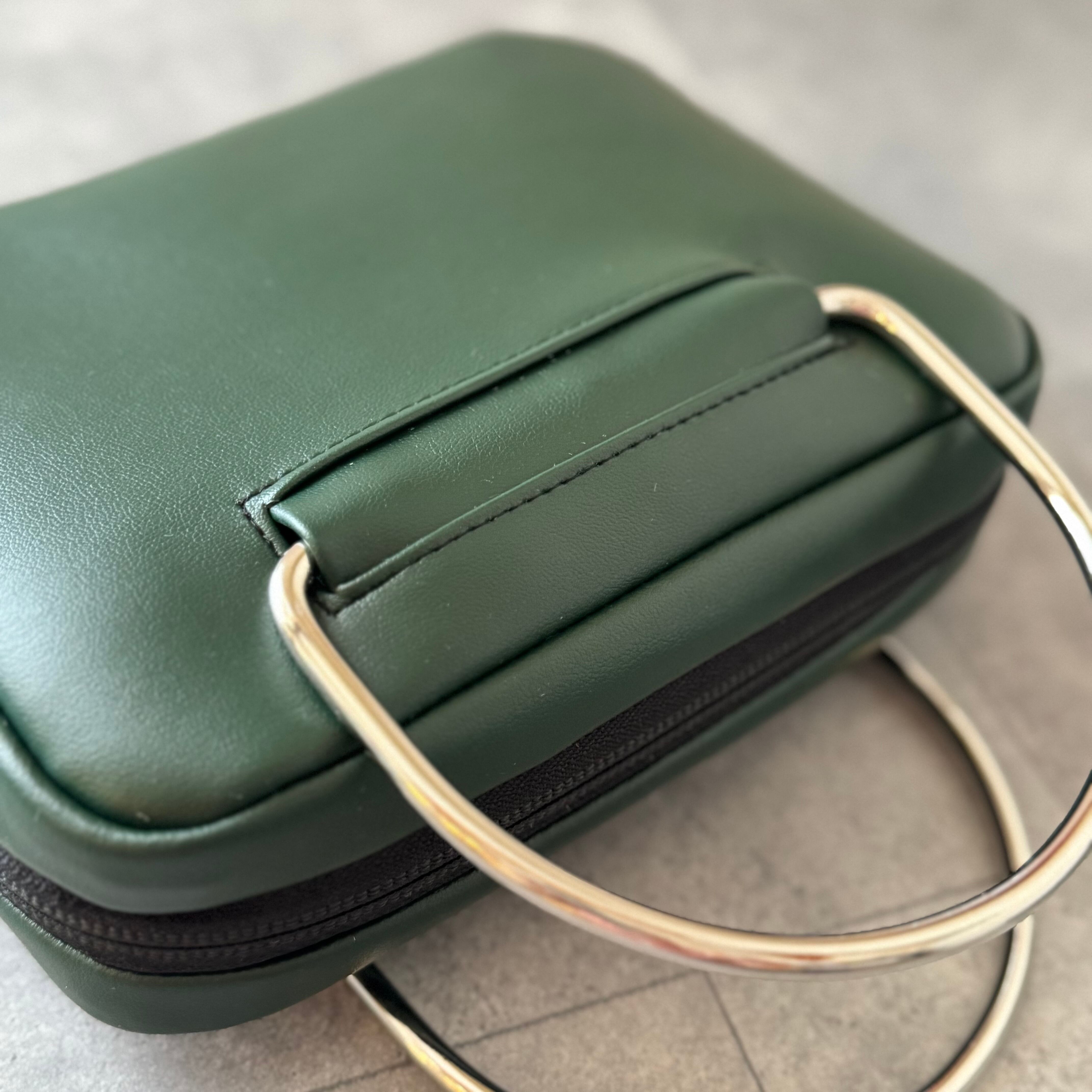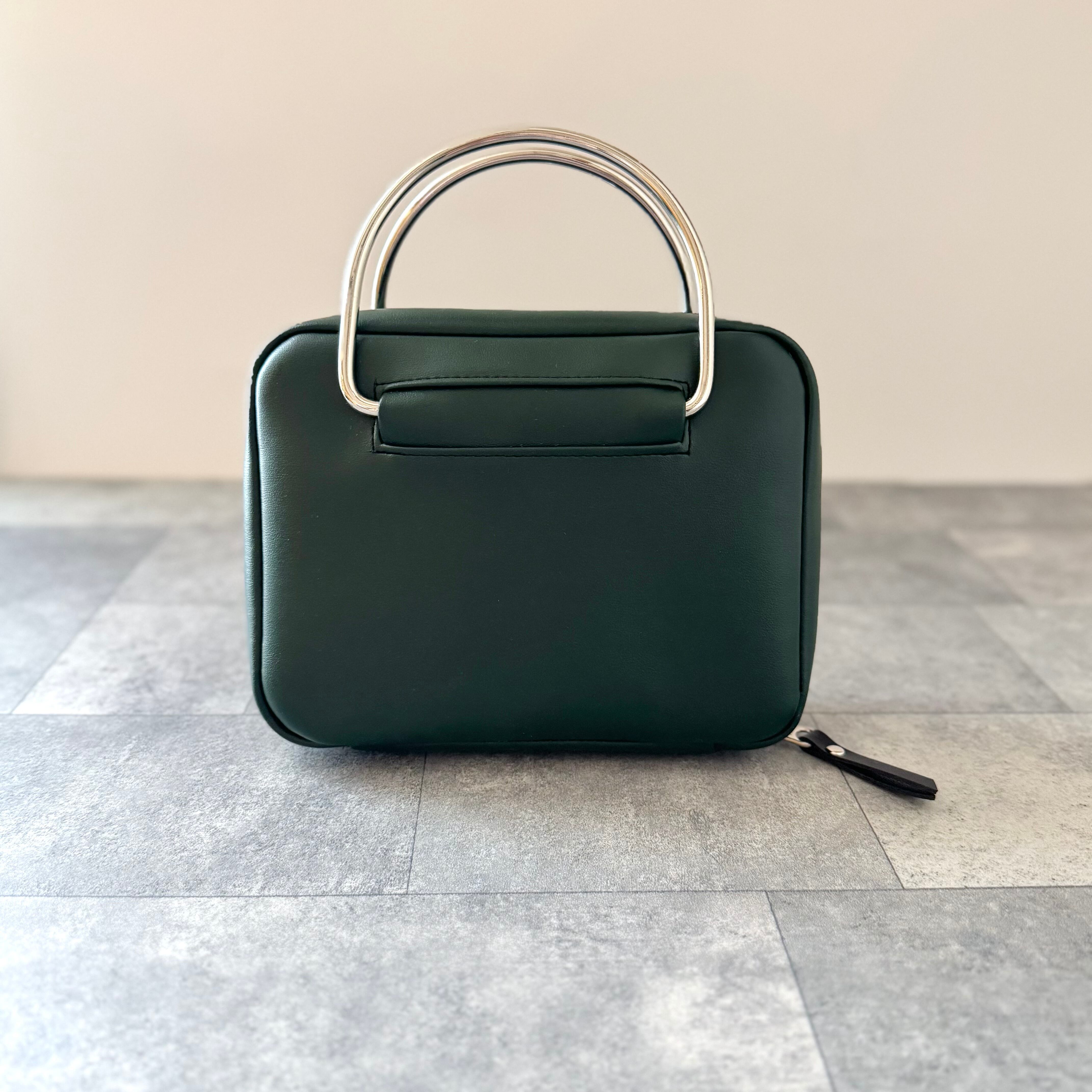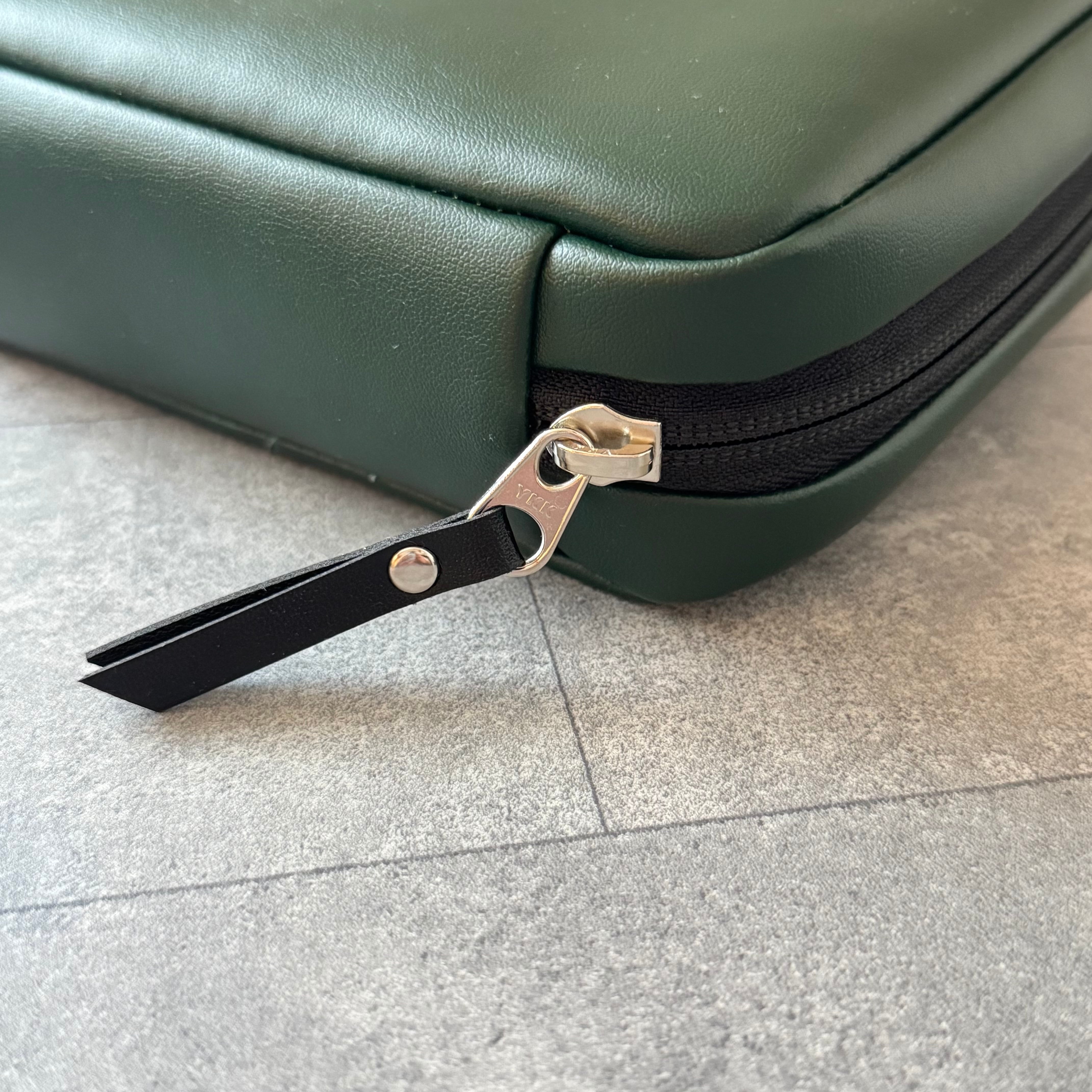 マットなグリーンの合皮にシルバーの金具を合わせてスタイリッシュな印象に仕上げました。