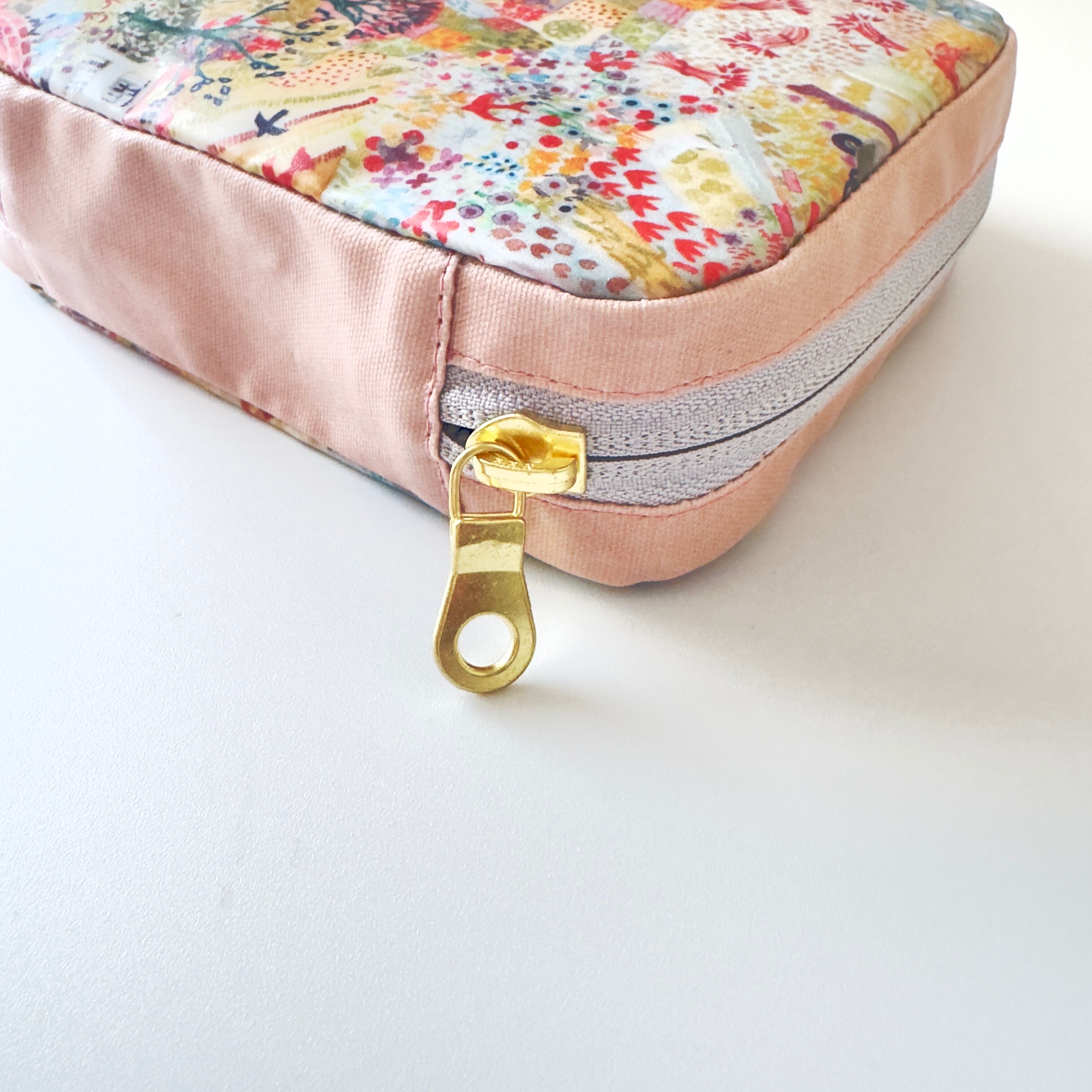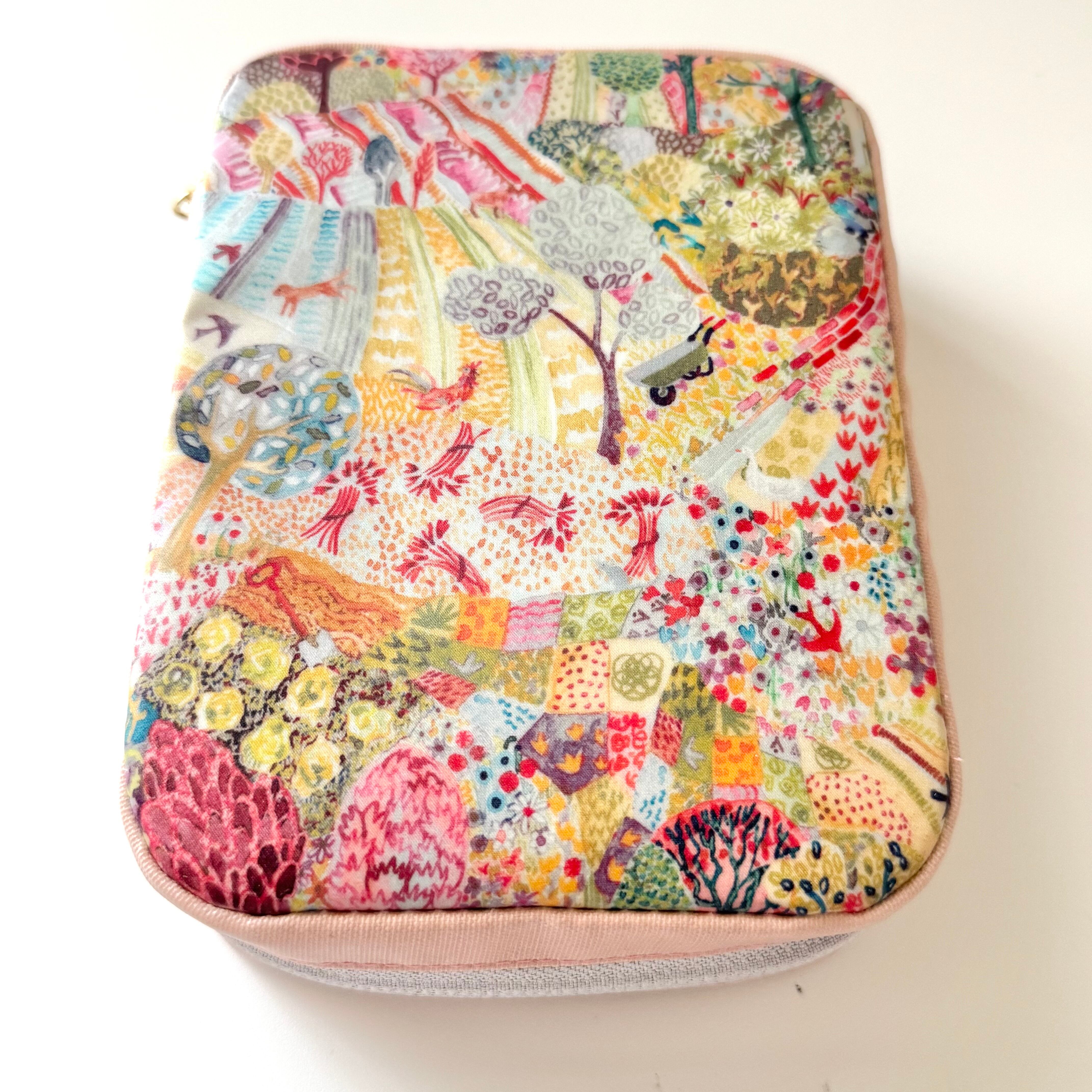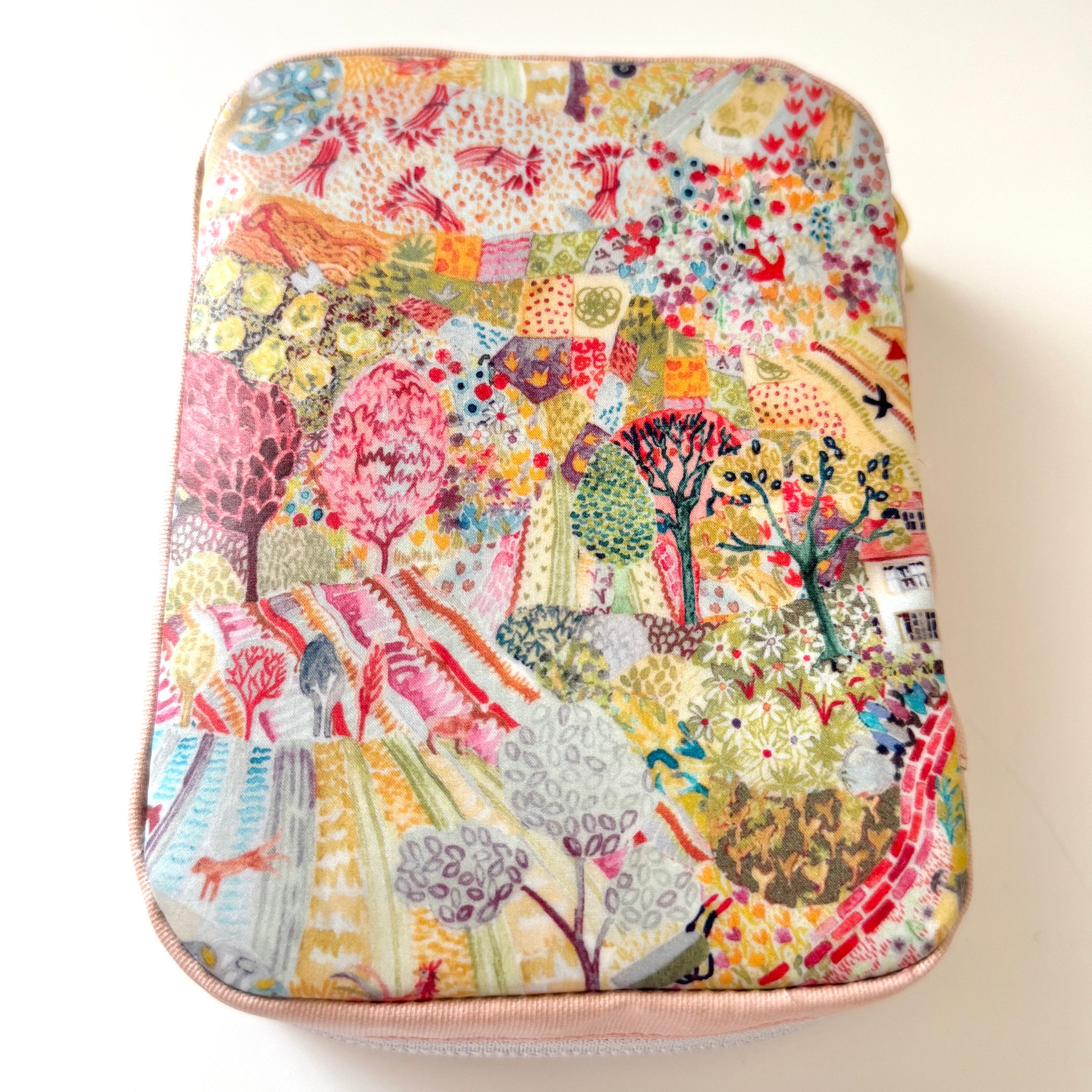 表地には絵本の水彩画のような愛らしい柄のリバティラミネートを使用。